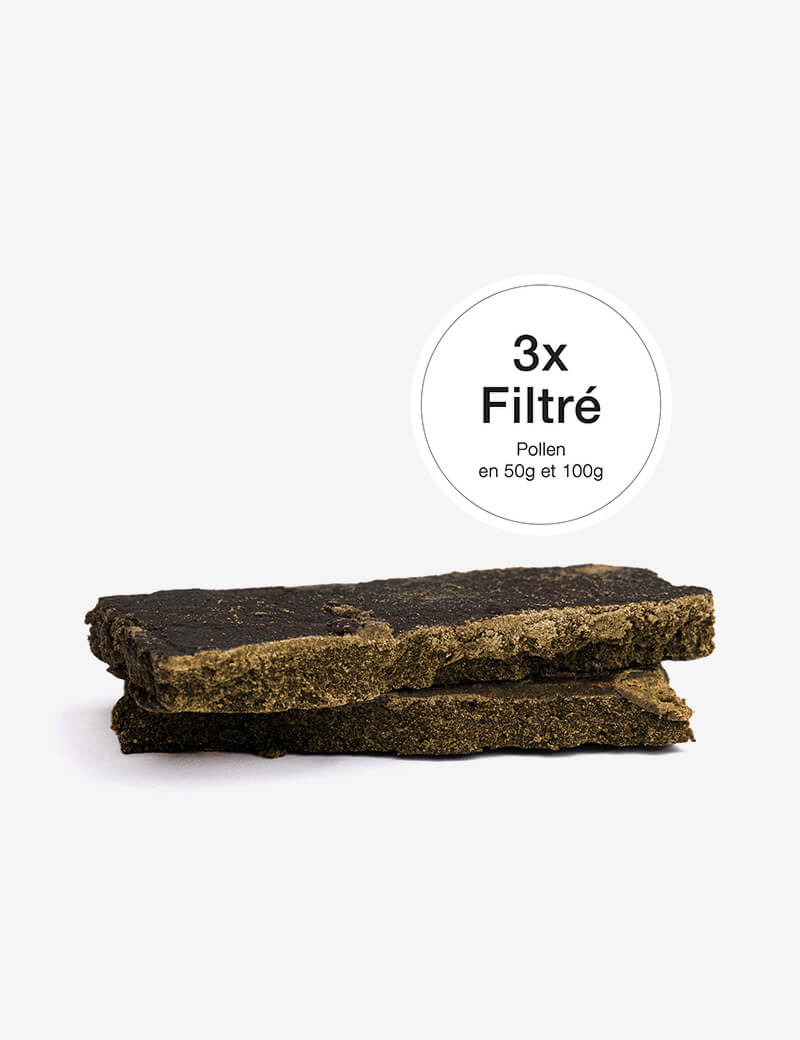 Après la filtration, il ne reste que les trichomes, ces petites glandes riches en CBD, CBN, CBG et THC < 0,3%, qui possèdent de nombreuses propriétés pour le bien-être. Ces trichomes sont ensuite pressés pour obtenir un pollen 3x Filtré de très grande qualité, ultra pur, riche en arômes et bienfaits, symbole du savoir-faire artisanal et de la qualité supérieure.