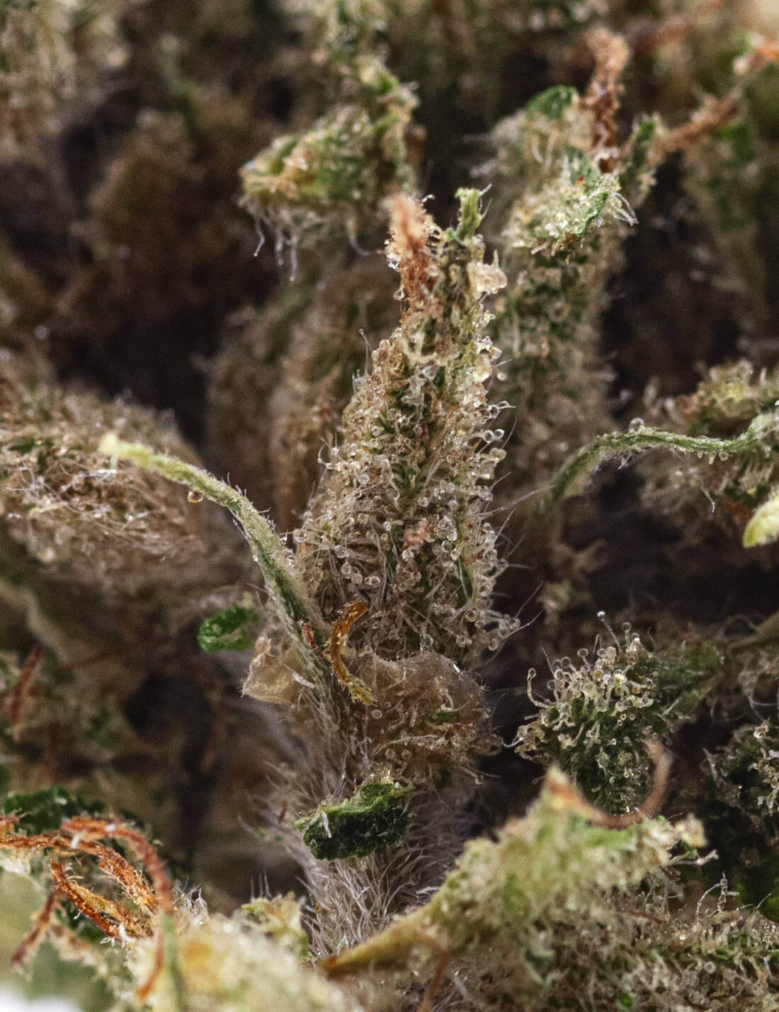 - Uiterlijk: Dichte toppen, lichtgroen, feloranje stampers, kristalachtige trichomen